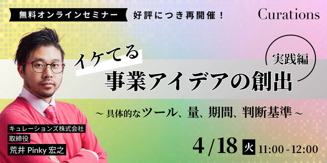 顧客企業のビジネス変革を成功に導くキュレーションズ株式会社(本社:東京都渋谷区、代表取締役社長:根本隆之、以下当社)は、『イケてる事業アイデアの創出:実践編 ~具体的なツール、量、期間、判断基準~』を2023年4月18日(火)に開催いたします。