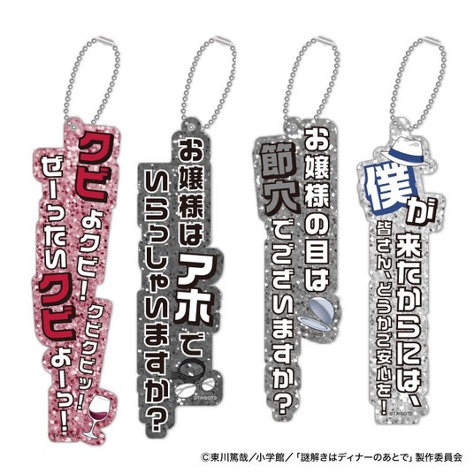 全4種。キャラクターの名台詞がそのままアクリルキーホルダーに。ラメ入りのアクリルが目を引くデザイン。