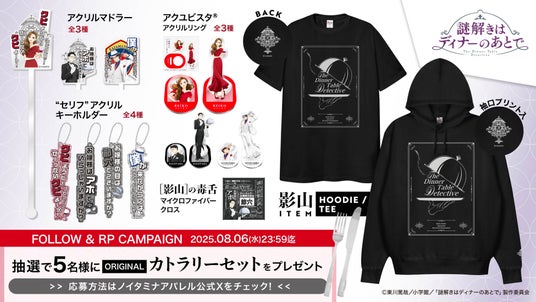 バナナスピリッツ株式会社(本社:東京都港区 代表取締役:米山博)が運営するフジテレビ深夜アニメ枠“ノイタミナ”から生まれたアパレルブランド「ノイタミナアパレル」は、2025年7月23日(水)から、TVアニメ『謎解きはディナーのあとで』より、新商品を販売開始いたします。新商品販売開始にあわせて、フォロー&引用リポストキャンペーンも実施いたします。