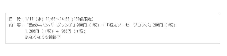 オープン前日の1/11(水)は、プレオープンイベント実施。名物ハンバーグランチを半額以下の500円で提供!