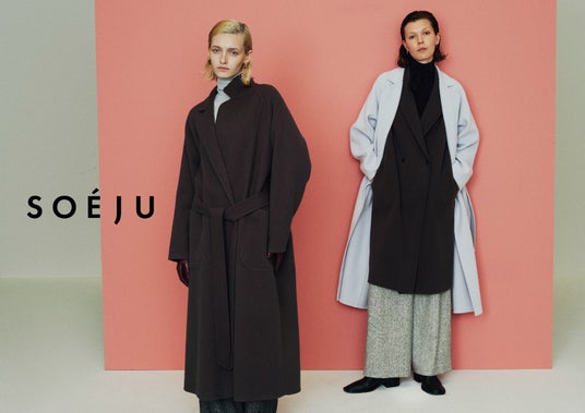 「SOEJU」2024FALL&WINTERコレクションでは、オーストラリア・ジーロン地方で育てられた羊の上質なウールを使用し、まるでカシミヤのような柔らかい風合いが特徴の、衿もと3WAYで着られるデザインの本格派ベーシックコート「ジーロンラムステンカラーコート」や、纏うだけで佇まいから美しくなるウールコートとして毎年人気の「ウールリバーローブコート」など、大人の女性の日々に寄り添う上質な素材とシルエットにこだわったコートをバリエーション豊かにラインナップしました。