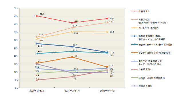一般社団法人日本能率協会(会長:中村正己、JMA)は、企業が抱える経営課題を明らかにし、これからの経営指針となるテーマや施策の方向性を探ることを目的に、1979年から、企業経営者を対象に、「当面する企業経営課題に関する調査」を実施しています。今年は2022年7~8月に実施し、689社からの回答を得ました。