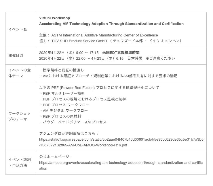 国際的な第三者認証機関であるテュフズード (本部:ドイツ ミュンヘン) は、米国 ASTM International Additive Manufacturing Center of Excellence 主催のインターネット上のイベント 「Virtual Workshop - Accelerating AM Technology Adoption Through Standardization and Certification」に開催協力します。