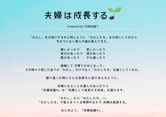 家庭は社会の最小単位であり、子どもたちが最初に触れる社会そのもの。『夫婦会議』は、ちょっとしたことから大切なことまで、前向きな気持ちで「対話」できる家庭環境づくりを応援します。