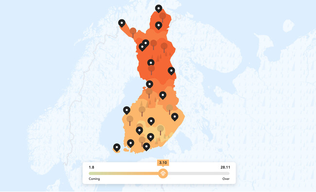 「紅葉ライブマップ『Autumn Foliage Live Map』は、ルスカ の状況をAIで予測しその結果を使いやすいマップビューで表示します。本サービスは、フィンランド全土の道路カメラなどのデータを活用し、ルスカの進行状況を表示したものであり、フィンランドでいつ、どこを旅行すれば色鮮やかな紅葉が見られるかがわかります。AIが情報を処理・改善し、天気予報を活用しながら、南のHanko(ハンコ)から北のEnontekiö(エノンテキオ)までの紅葉の動きをリアルタイムで視覚的にガイドします。」