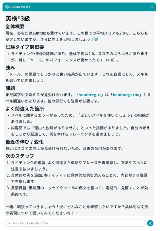 「ライティングの練習方法は?」「よく間違えるポイントは?」など、あらかじめ用意された質問をワンクリックで選べるほか、学習者が質問を入力するとUGUIS先生が回答してくれます。 さらに、「よく間違えた文法を具体的に教えて」「よく間違える単語を一覧で出して」など、より詳細なアドバイスもUGUIS先生から受けられます。 指導者はUGUIS先生と共に学習者のこれまでの取り組みを見守りながら、学習者自身が自律的に理解を深め、成長していくプロセスを支援できます。