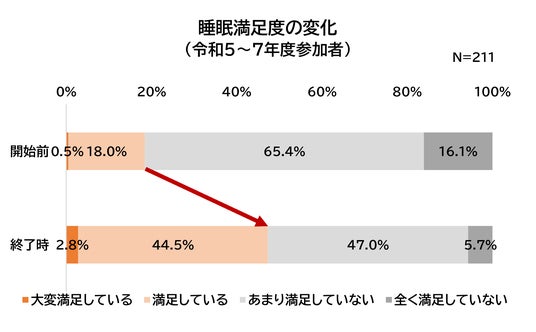 本事業の開始前と終了時の睡眠満足度を比較したところ、「睡眠に満足している」と回答した割合は、開始前18.5%から終了時47.3%へと大きく増加しました。