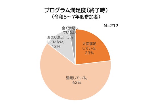 本事業に関する満足度を終了時アンケートにて確認したところ、85%の参加者が「大変満足している」「満足している」と回答しており、プログラム全体に対する高い評価が確認されました。