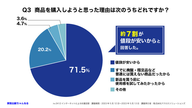 Q3 中古品購入の理由として「値段が安いから」が71.5%で最も多いことが分かりました。