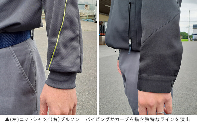 目につく部分のパイピングには別の色を入れてアクセントにする場合が多く、今回は敢えて黒のブルゾンに同色のパイピングを入れる処理を行った。