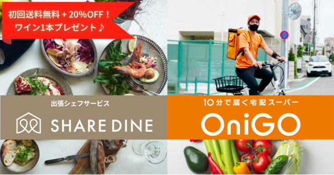 栄養士から一流レストランシェフまで約1,800名のシェフが登録する出張シェフサービス「シェアダイン」を運営する株式会社シェアダイン(共同代表:井出有希、本社:東京都港区、以下シェアダイン)は、10分で届く宅配スーパー「OniGO」を運営する株式会社OniGO(代表取締役:梅下直也、本社:東京都渋谷区、以下OniGO)と2021年12月22日よりサービス連携を開始いたします。