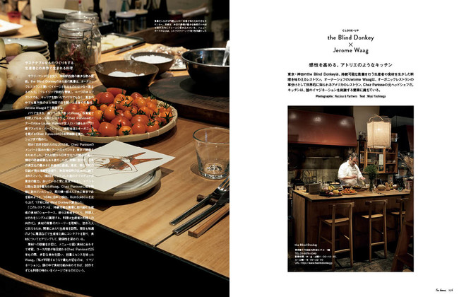 東京・神田のthe Blind Donkeyは、持続可能な農業を行う生産者の食材を生かした料理を味わえるレストラン。オーナーシェフのJerome Waagは、オーガニックレストランの草分けとして世界的に知られるアメリカのレストラン、Chez Panisseの元ヘッドシェフです。キッチンは、彼のイマジネーションを刺激する要素に満ちていました。