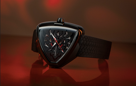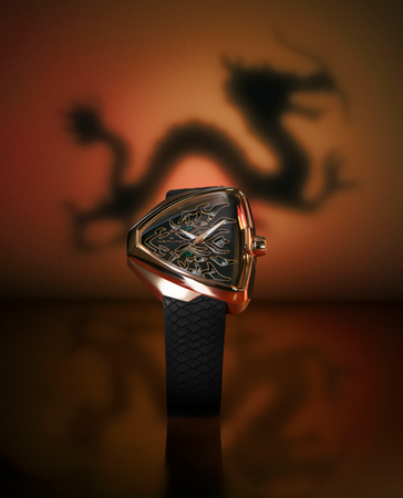 文字盤に施された印象的なカットからは、力強さと勇気に満ちたドラゴンの顔が浮かび上がります。ドラゴンの顔は文字盤上で時計回りに90度回転し、「ベンチュラ」のアイコンである前衛的で幾何学的な盾の形に完璧にマッチしています。