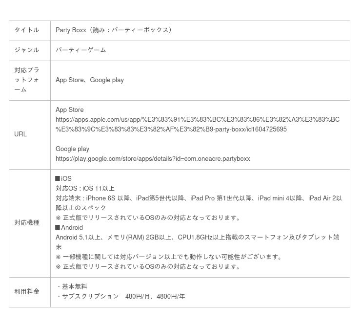株式会社トリドリ(本社:東京都渋谷区、代表取締役社長:中山貴之、以下toridori)は、株式会社One Acre(読み:ワンエーカー、本社:埼玉県さいたま市、代表取締役:折茂賢成)と共同開発したパーティーゲームアプリ『Party Boxx』を本日12月15日にリリースいたしました。
