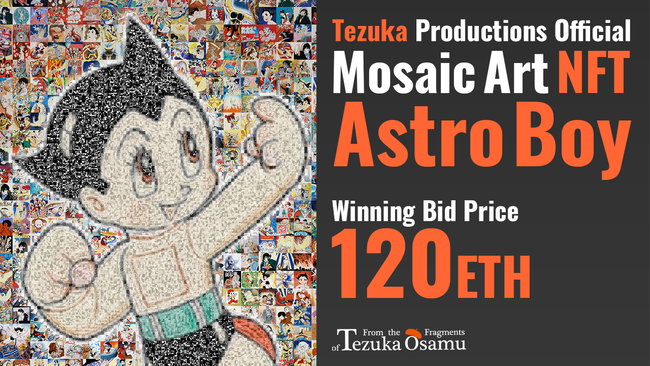 手塚治虫氏の漫画原稿で構成されたモザイクアートNFT「鉄腕アトム」が、2021年12月18日にNFTマーケットプレイスOpenSeaで行われたオークションにおいて120ETH(約5300万円)で落札されました。