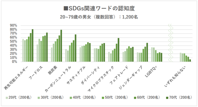 ・「脱炭素」などの関連ワードの認知も、概ね60代以上のシニア層が高い。20~30代は「LGBTQ+」の言葉の認知が高い。