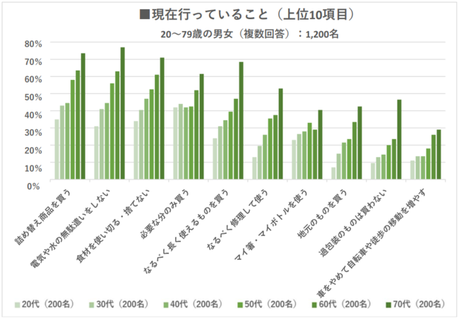 ⇒現在行っていることは、世代を問わず「詰め替え商品を買う」「電気・水の節約」「食材を使い切る」が上位。