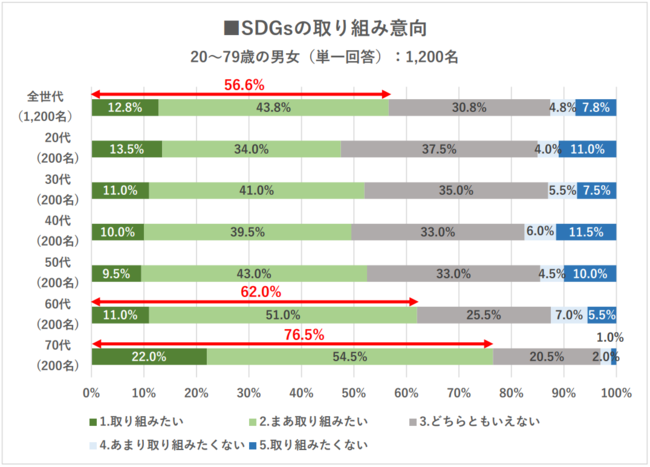 ⇒SDGsに取り組みたい割合は全体の56.6%。60代は62.0%、70代は76.5%と他世代よりも高い。