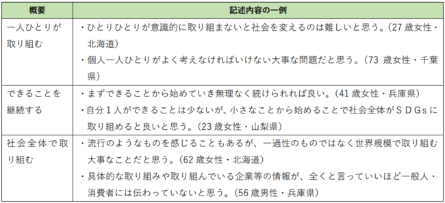 ⇒「一人ひとりが取り組む」「小さくてもできることを続けることが大切」という意見は全世代共通で見られた。