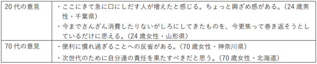・「一人ひとりが取り組む」「小さくてもできることを続けることが大切」という意見は全世代共通で見られた。その他、若者世代では、「今、ブームのように感じる」「興ざめ感がある」、70代は「便利に慣れすぎた反省」や「義務」だと捉える声もあり。
