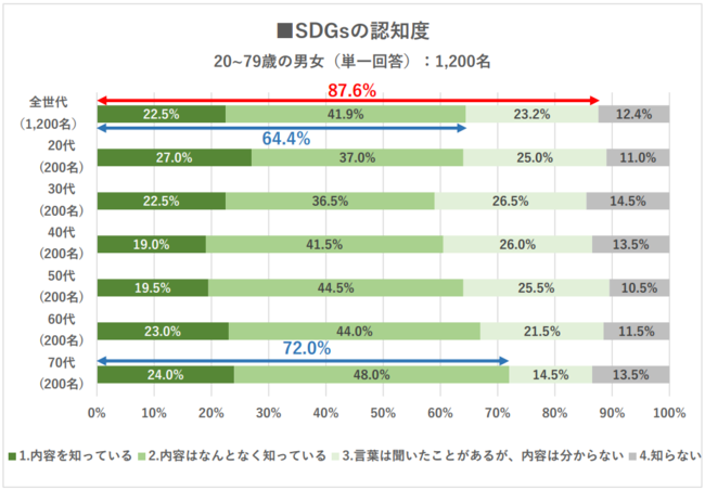 ・SDGsの認知度は、「言葉は聞いたことがあるが、内容は分からない」まで含めると全世代で87.6%。