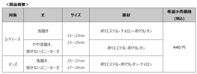 パンプスやフラットシューズに合わせやすい「浅履き」タイプや「やや深履き」タイプ、スニーカー専用の「見せないスニーカー丈」タイプ。また、黒・グレー・ネイビーなどベーシックカラーの他、この春からは爽やかなサックスやシェードブラウンなどの新色も登場するなど、ファッションや気分に合わせてお選びいただける豊富なバリエーション展開です。