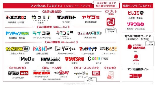 また、「コミチ+」の導入により、先行して導入している「チャンピオンクロス(秋田書店)」「ヤングアニマルWeb(白泉社)」「竹コミ!(竹書房)」「ハヤコミ(早川書房)」をはじめとする21のメディアと共通のIDが使用可能になります。この仕組みが、新作の認知拡大に寄与することが期待されています。