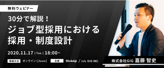 ジョブ型採用支援サービス「Workship(ワークシップ)」を運営する株式会社GIGが、ジョブ型採用に関するウェビナーを開催いたします。今注目が集まるジョブ型採用における制度設計について、実際にお客様からいただくご質問を交えて解説いたします。
