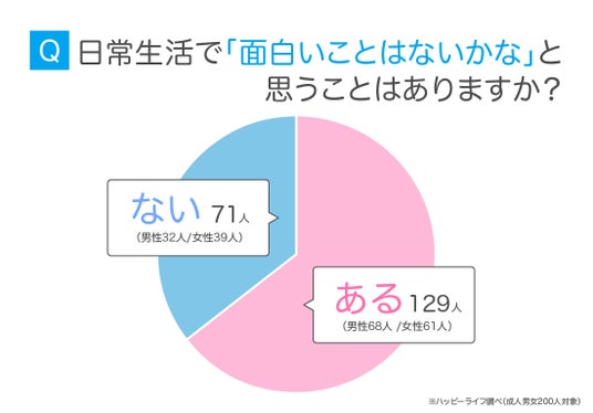 《日常生活で「面白いことはないかな」と思うことはありますか?》とアンケートを取ったところ、「ある」と回答した人は129人、「ない」と回答した人は71人でした。