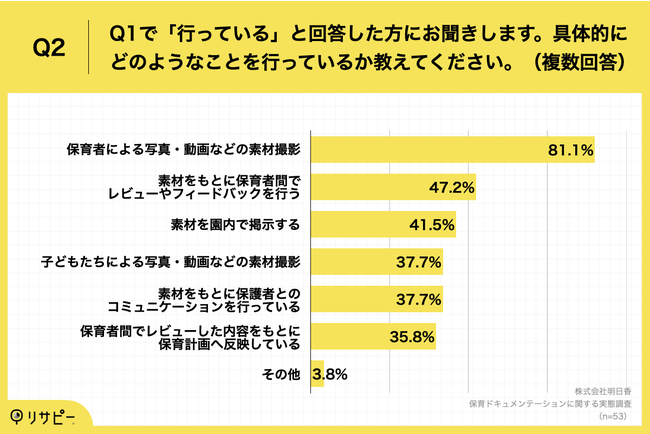 Q1で「行っている」と回答した方に「Q2.具体的にどのようなことを行っているか教えてください。(複数回答)」(n=53)と質問したところ、「保育者による写真・動画などの素材撮影」が81.1%、「素材をもとに保育者間でレビューやフィードバックを行う」が47.2%、「素材を園内で掲示する」が41.5%という回答となりました。