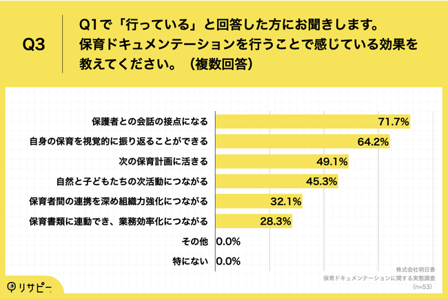 Q1で「行っている」と回答した方に「Q3.保育ドキュメンテーションを行うことで感じている効果を教えてください。(複数回答)」(n=53)と質問したところ、「保護者との会話の接点になる」が71.7%、「自身の保育を視覚的に振り返ることができる」が64.2%、「次の保育計画に活きる」が49.1%という回答となりました。