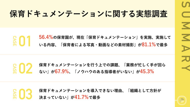 今回の調査では、現在「保育ドキュメンテーション」の導入が半数以上進んでおり、未導入保育園においても、半数が、保育施設としての質向上のために「導入すべき」と考えていることが明らかとなりました。一方で、導入するべきか分からない、あるいは、組織として方針が決まっていないという保育園も多く、保育ドキュメンテーションの意義が普及していないケースも少なくないことが伺えました。また、保育ドキュメンテーションを導入することがいかに保育園の質向上に繋がるのかを理解したとしても、保育士の負担増加を筆頭に、園内の意識改革なども必要になることから、日々のルーティンにするためには組織そのものの課題をクリアし、心理的安全性が確保された環境を築くことが求められているとも言えます。保護者との会話の接点が増え、保育士自身の保育を視覚的に振り返る材料となる「保育ドキュメンテーション」。選ばれる保育施設となるためには、保育の質向上を担う手段として、今後益々需要が増えるのではないでしょうか。
