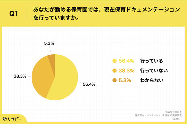 「Q1.あなたが勤める保育園では、現在保育ドキュメンテーションを行っていますか。*なお、ここでいう保育ドキュメンテーションとは、保育者間での保育に関するレビューやフィードバック、保護者とのコミュニケーションで用いるために子どもの活動を写真や動画、音声、文字などで視覚的に記録するというものを指しています。」(n=94)と質問したところ、「行っている」が56.4%、「行っていない」が38.3%という回答となりました。