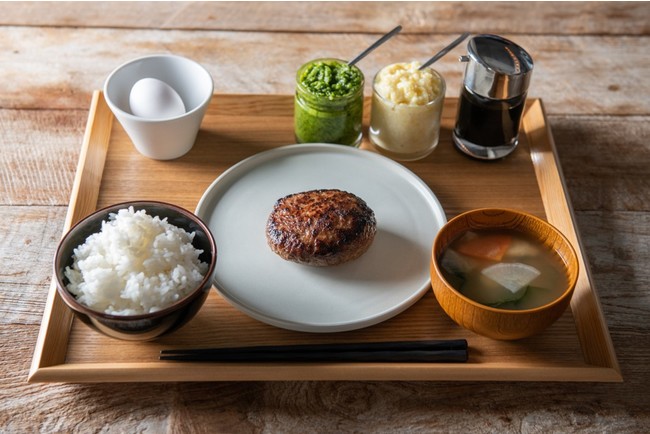 ■内容 :牛肉100%ハンバーグ、ご飯、みそ汁、生卵、薬味(椒麻/レモン生塩麹/自家製昆布醤油)
