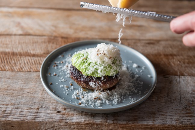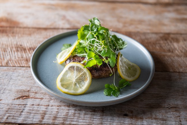 焼き立てのハンバーグに、たっぷりのフレッシュパクチーと無添加レモンをのせて。特に女性で増えているパクチー好きの「パクチ二スト」「パクチーラバー」に向けて!