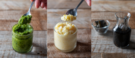 写真左から、椒麻(ジャンマー)/レモン生塩麹/自家製昆布醤油