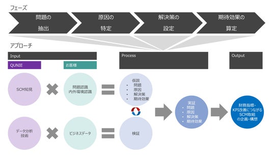 コンサルティングファームの株式会社クニエ(NTTデータグループ、本社:東京都千代田区、代表取締役社長:山口 重樹、以下クニエ)は2025年4月3日より、企業のサプライチェーンマネジメント(SCM)向けの新サービス「SCMデータインサイト・コンサルティング」の提供を開始します。本サービスは、企業のSCMに関する課題を定性/定量の両面から調査・分析し、財務指標やSCMのKPIに影響する「SCM戦略(生産方式や在庫配置など)」、「業務プロセス」、各種の「基準値(リードタイム、ロットサイズ、在庫基準など)」の改善・適正化を支援するコンサルティングサービスです。これにより企業は、財務的効果の高いSCMの取り組みを企画・実行することが可能になります。具体的には、SCMに関する深い知見と高いデータ分析力を備えるクニエのコンサルタントが、SCM担当者に対するインタビューと受注実績や在庫といったサプライチェーンのビジネスデータを分析し、問題とその原因を特定、解決策を策定します。加えて、財務指標やSCMの業務KPIに対し期待できる効果を予測、評価・検証することで、より実効性の高い取り組みを可能にします。