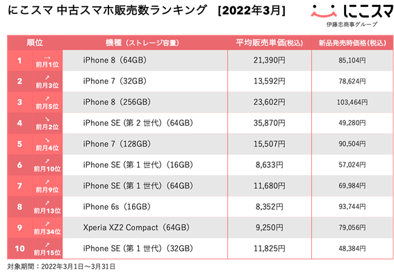 にこスマ 中古スマホ販売数ランキング [2022年3月]