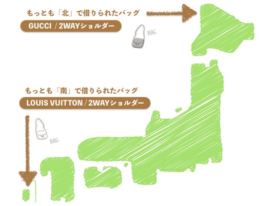 日本最北端エリア(北海道稚内市)では、「GUCCI」の2WAYショルダーが活躍し、最南端エリア(沖縄県石垣市)では「LOUIS VUITTON」の2WAYショルダーが活躍しました。