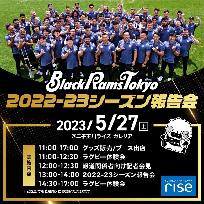 東急田園都市線・大井町線「二子玉川駅」直結の複合商業施設「二子玉川ライズ」では、NTTジャパンラグビー リーグワン2022-23シーズンを7位で終えた「リコーブラックラムズ東京」の選手・スタッフより、ファン、ホストエリアの皆さまへ直接感謝を伝えるイベント「リコーブラックラムズ東京 2022-23シーズン報告会」を、2023年5月27日(土)11:00~17:00に、二子玉川ライズ ガレリアにて開催します。