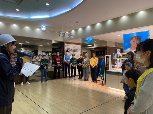 従業員と小学生、保護者と共に、営業時間中に地震とそれに伴う火災が発生したという想定の下、商業施設内で被災した場合にはどのように避難すればよいのかを体験します。