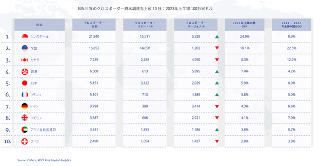 APACはグローバルな資本供給源として影響力を拡大しており、シンガポール、香港、日本が世界のトップ5にランクインしています。シンガポールは2023年現在、世界最大の投資国としてトップに立っており、クロスボーダー資本は投資総額の24.9%を占め、2018年から2022年の8.9%から上昇しています。シンガポールはクロスボーダー資本のほとんどを自国内の不動産に費やしています。