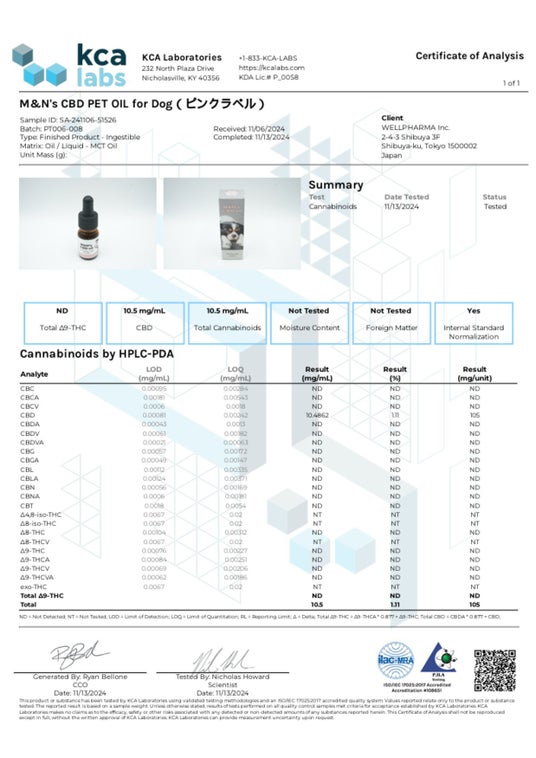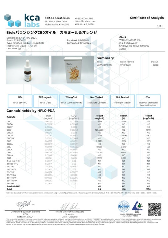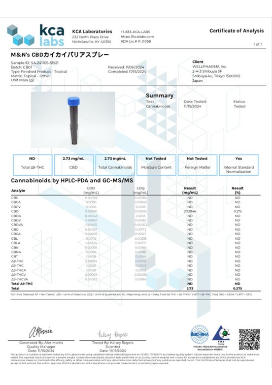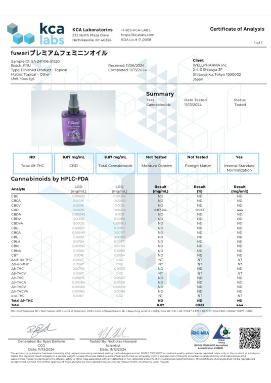 株式会社ウェルファーマ(以下、弊社)は、2024年12月12日に施行される大麻取締法改正に対応すべく、CBD製品のTHCの限度値に準拠する分析証明書を取得。