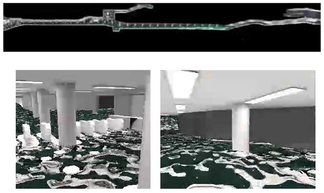 具体的には、対象となる施設の点群データを取得した上で、数cm程度の段差を再現した精緻な3次元モデルを構築し、Unity※1上で空間再現します。再現された仮想空間では、現実空間と同様に、施設内のどこへでも自由に入り込み内部を確認することが可能です。浸水シミュレーションは、建物周辺の冠水を起点とし、各経路を通じた地下への浸水をサイバー空間内で再現します。また、施設内への水の流入量の変化や、止水板等の浸水対策の有無を加味する機能を実装し、対策設備の効果についても検証を行うことができます。