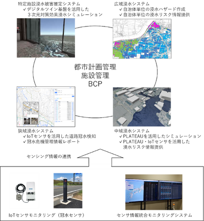 今後は、デジタルツイン基盤を活用した本サービスに加え、当社が開発したIoTセンサ(冠水センサ、水位計等)との連動を含めた機能強化を図り、浸水の事前対策としてのシミュレーションから、ハード対策のコンサルティング、実際の水位上昇を検知した上で防災行動を支援するシステムソリューションの提供まで、お客様の浸水被害低減に向けたワンストップサービスの開発と提供をめざしてまいります。