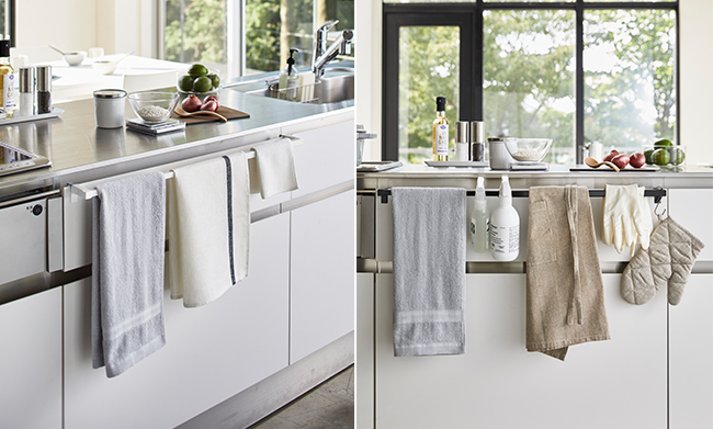 扉に合わせて伸縮できるから大容量に収納できる伸縮ロングタオルハンガー。