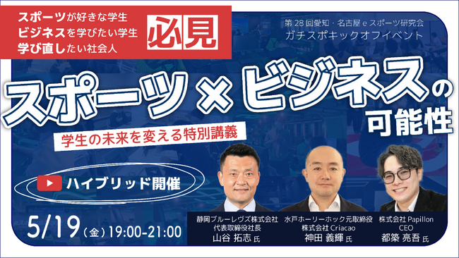 2023年5月末より第三期を迎えるガチスポのキックオフイベントとして、スポーツ・eスポーツ業界で活躍する経営者を名古屋にお招きし、特別講義をしていただきます。