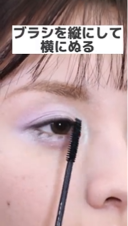 マスカラを縦にして毛束感のあるまつ毛に。根元からまつ毛全体に液を付けるように、毛流れに合わせてまとめるのがポイント!