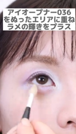 アイホール全体と下まぶた全体には薄いパープル、目頭と下まぶた目尻にはグリーン、さらにグリーンのアイシャドウにラメを加えることで、濡れ感のある目もとに。