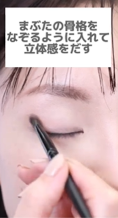 まぶたの骨格をなぞるように、アイホール全体と下まぶたにピンクブラウンの